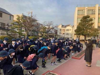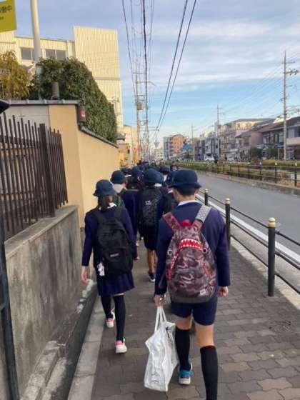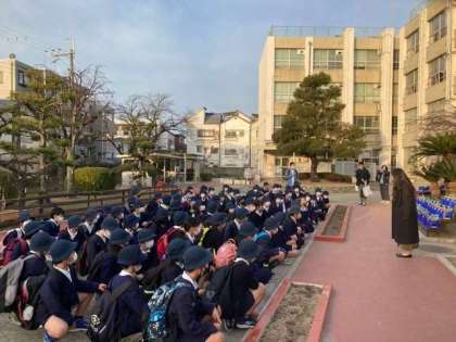 晴天の下、6年生は卒業遠足に向けて出発しました。