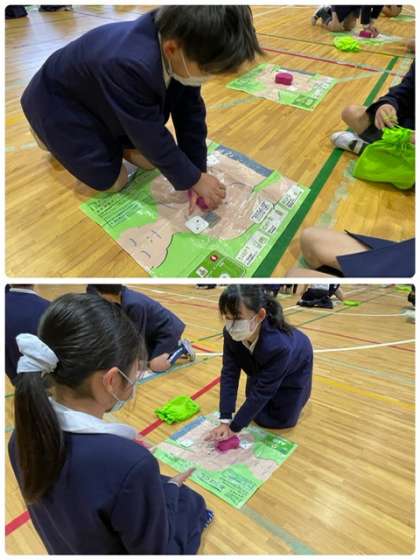 救命の仕方をDVDで学習し、実際に「アッパ君」を使い、心臓マッサージの体験をしました。