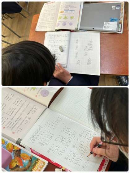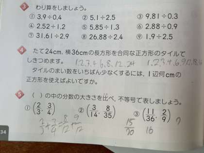 今日もまとめのページで復習しました。タイルの敷き詰め問題が難しかったようで、先生の解説を聞きました。