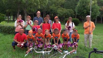 おそろいのオレンジのTシャツに、同じ色のバンダナ。