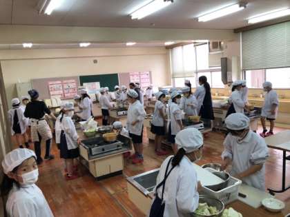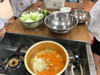 家庭科 調理実習の様子です。ゆで野菜のサラダとドレッシングを作っていました。
