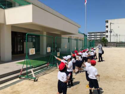 空のマヨネーズの容器に、水をたくさん入れて的当てを楽しんでいました。