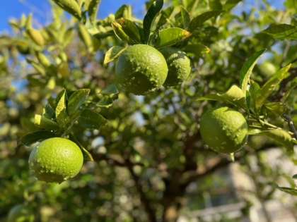 昨夜の雨を受けて、横堤果樹園では秋の収穫を待つ果物たちが、日の光を浴びてキラキラと輝いています。