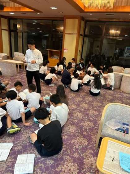 班長、室長が集まって、1日の反省の時間です。明日の予定も確認しています。今日は、協力してパルケエスパーニャでよくがんばりました。他の学校の先生が感心していました。明日もルールを守って活動してほしいものです。