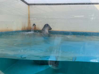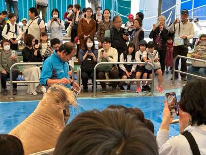 セイウチのショーが始まりました。エイやタコを触っている人もいました。ゴマフアザラシは、寝ているようです。