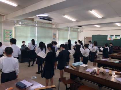 メロディに合わせて歌っていました。高音が美しく、高学年らしい歌声でした。