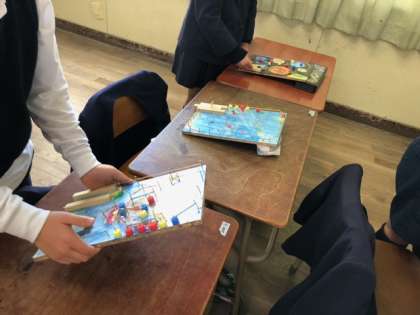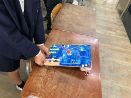 完成した作品にビー玉を転がして遊びました。遊びながら、友だちの工夫も感じているようです。