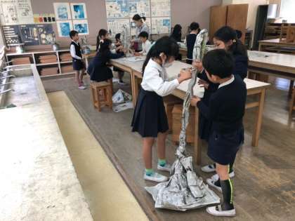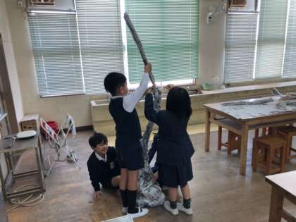 新聞紙30枚とテープのみでタワーをつくります。どのグループが高くて、立派なタワーをつくるのでしょうか。話し合いながら、盛り上がっています。