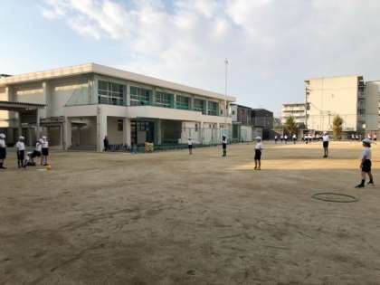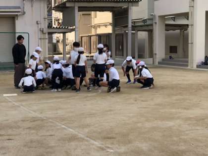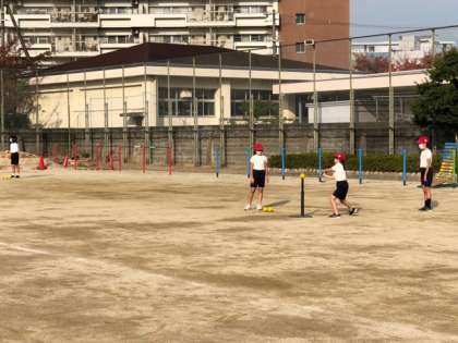 先生から説明を聞き、ゲームを行っていました。チームワークよく、活動しています。ティーベースボールは、小さなボールに当てるのが難しいようです。