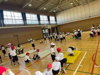 マットの上でさまざまな動きを楽しむ学習です。今日は後ろ回りに挑戦です。みんな頑張っています。