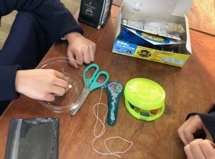 じしゃくについた鉄はじしゃくになったのかを実験していました。友だちと確かめ合いながら、ふしぎを体感しています。