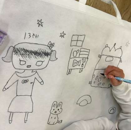 ふくろに楽しい様子の絵を描いていきます。この後、色えんぴつで色をぬっていきます。集中して頑張っています。
