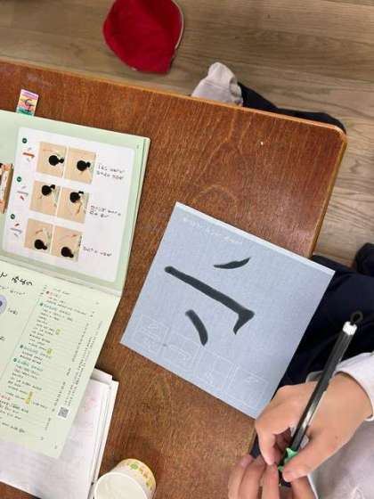 初めて筆を使って字を書きました。鉛筆と違って少し書きにくいのか、少し戸惑っていましたが、慣れていくうちに上手に書けるようになりました。