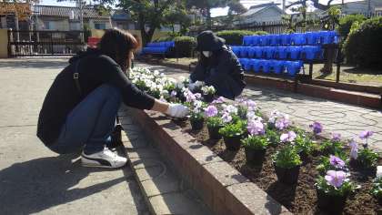 本日PTA緑化委員の方々が、前庭にパンジーの花を植えてくださいました。