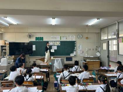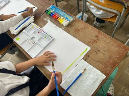 絵の具の使い方を学んでいました。水の量を調整して筆で画用紙に線を描いていきます。なかなか難しいようです。