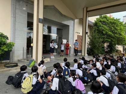 開舎式の様子です。修学旅行のスローガンを最後まで守って行動できますように…