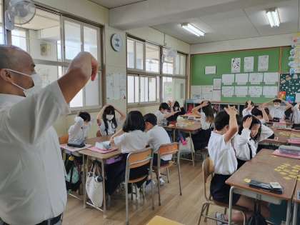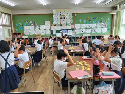身の回りの物の英単語でカルタをしています。よく集中出来ています。