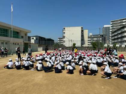 大きな地震に備えての避難訓練です。素早く運動場に避難できました。この後、津波に備えて高い所へ二次避難をします。