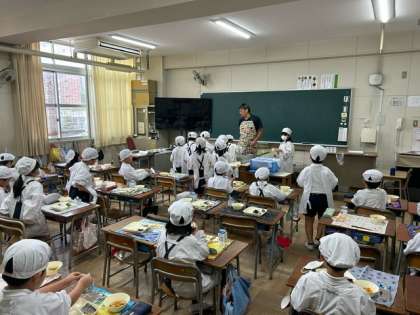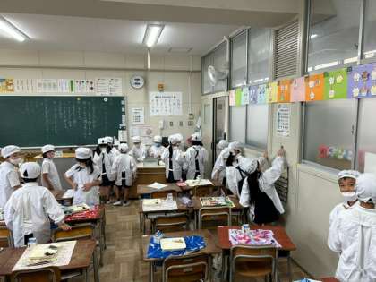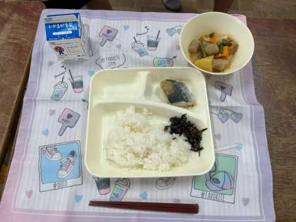 当番が配膳をしていました。今日の献立は含め煮とさごし、牛ひじきそぼろです。おいしくいただきます。