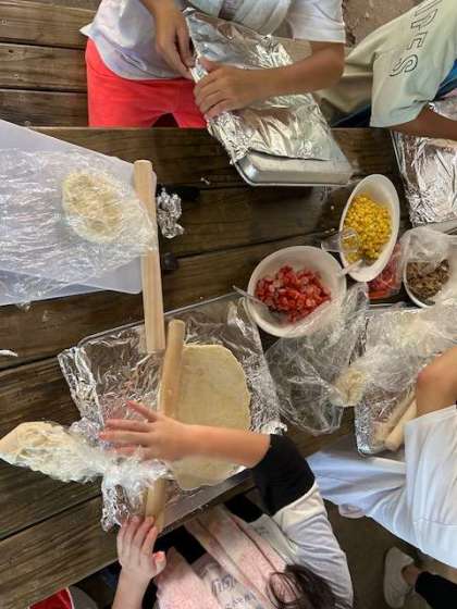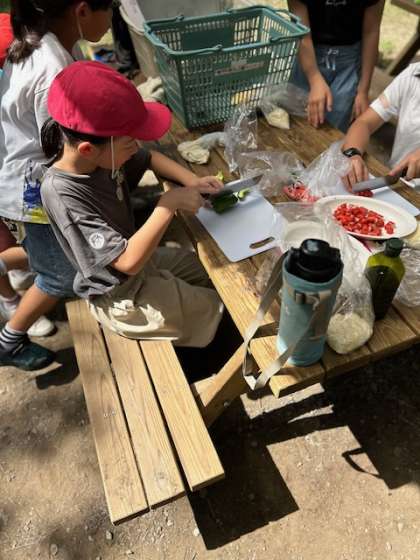 トッピングの具材のピーマンとウインナーを切り、寝かしていたピザの生地に打ち粉をしてのばします。