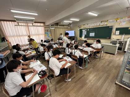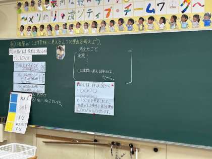地層がしま模様に見える理由を考えていました。班で意見を交流し、発表します。
