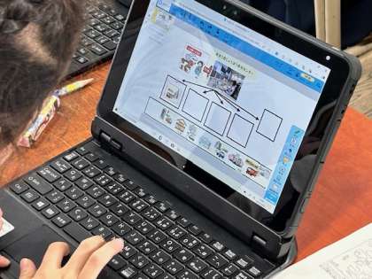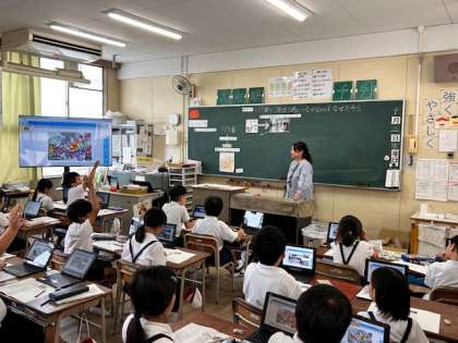 ICTも活用し、ワークシートが子どもたちへ一瞬で配布されました。子どもたちはイラストからどの機関に連絡が必要かを考えて指で選んで貼り付けていました!