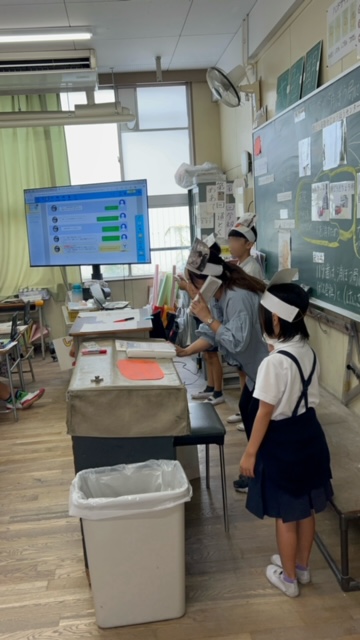 終盤では、先生が司令室の役、選ばれた子どもたちがそれぞれの期間の役割を、お面をかぶって実際の電話の内容を演じていました!