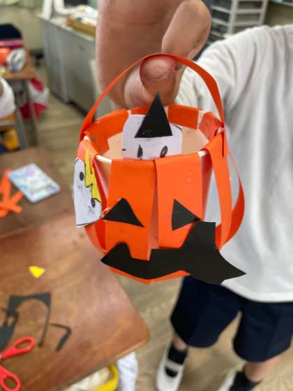 紙コップと画用紙を使って、かぼちゃのかざりをつくりました。中にはおばけが入っているようです。