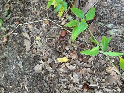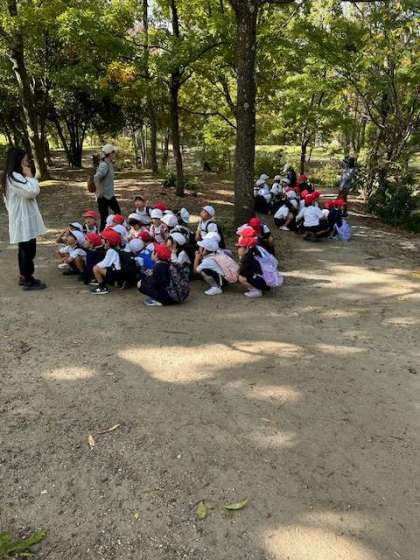 それぞれのクラスにわかれて、どんぐり拾いや落ち葉拾いをします。
