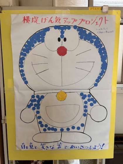 朝の挨拶、げん気にできたらシールがもらえて、校長室前のドラえもんに貼れます!
