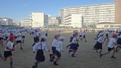 軽快な音楽とともに、朝の時間を使って全員で校庭を走ります。