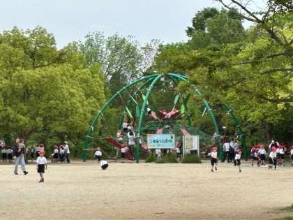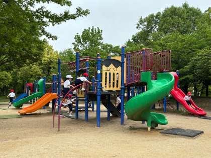 1年生はつるみっこパークに向かい、遊具で遊んでいます。