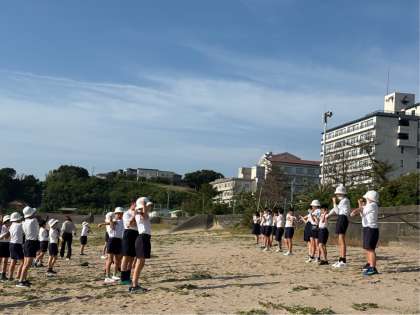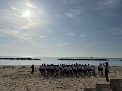 6:15に起床し、部屋を片付け、砂浜で朝の会です。今日もとっても良い天気。