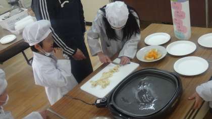 その後は、みんなでクレープ作り、バナナを切ったり、モモを切ったり、クレープを焼いたりとみんな手作です。