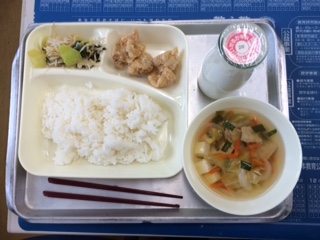 本日の給食は、鶏肉のからあげ、中華スープ、チンゲンサイともやしの甘酢あえです。