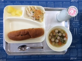 本日の給食メニューは、マカロニグラタン、レタスのスープ、レザートはりんごです。パンはレーズンパンで、とってもおいしいです。グラタンは、子どもたちに人気メニューです。