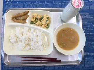 今日のメニューは、「きびなごてんぷら」、「みそ汁」、「えんどうの卵とじ」(卵除去食)です。