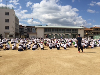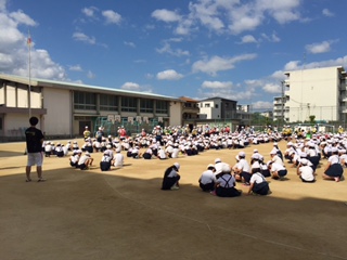 縦割り班に分かれて、各班で一つのボールを「ゴロゴロゴロゴロ……」とリードの児童が言っている間は回します。「ドン」と言った時、誰がボールを持っているでしょうか?