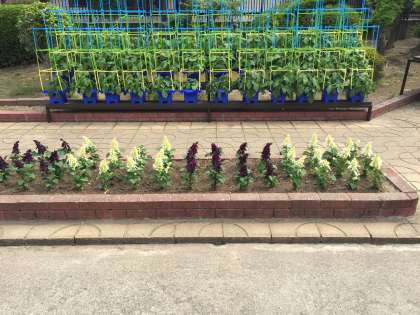 赤色は写真中断(校舎玄関向かって左 ペチュニア ブルーと同じ場所)