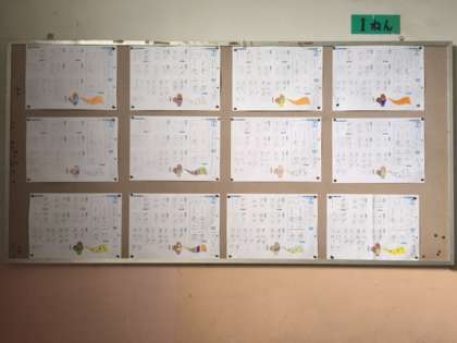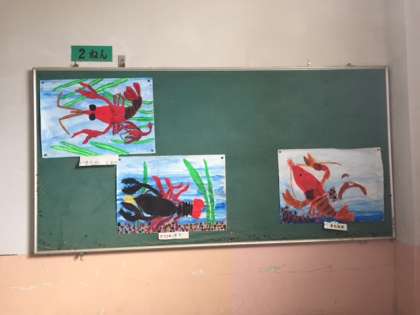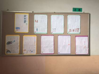 1年生、2年生、3年生の児童の作品が掲示されています。