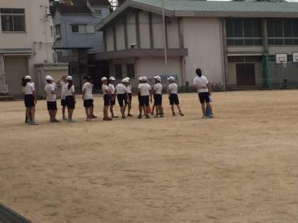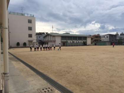 台風が西日本に接近しています。曇りの天候で、5年生は体育の授業を行っています。