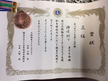 11月13日(日)に実施しました、大阪鶴見ライオンズクラブ主催の秋季球技大会における「キックベースボール」の表彰を行いました。