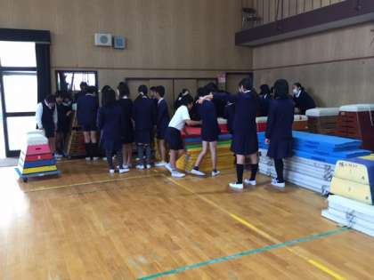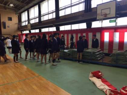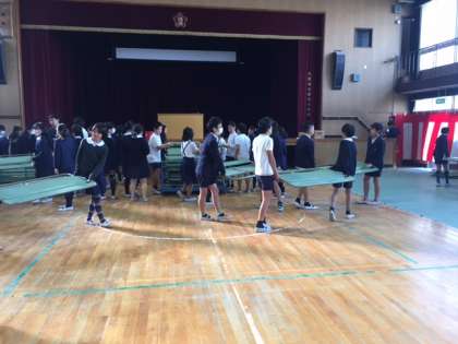講堂(体育館)の椅子出しをします。また、体育用具の移動をします。
