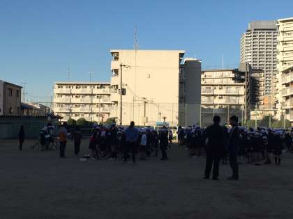 今日の児童集会は、「ジャンケン列車」をしました。ジャンケンをして、負けると後ろにつき、列車のようにつながっていきます。