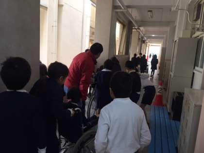 廊下、校内を車いすで移動します。
