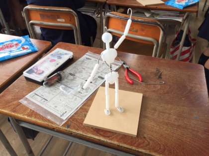 図画工作では、人体の模型をつくり、次に、粘土をつけていきます。