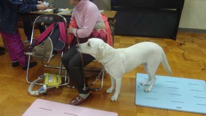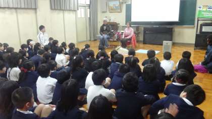 今日は3年生が、目の見えない山本美惠子さんのお話を聞きました。盲導犬の役割(フェリシアというメス犬です)、プールで泳いだり、卓球をやったりするにはどうするの?といった山本さんの生活ぶりを、ビデオも交えながら教えてもらいました。