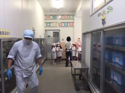 1年生の給食室での配膳の様子です。