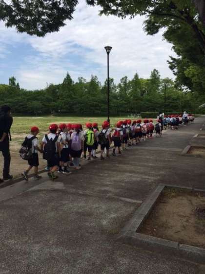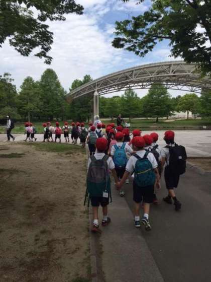 公園内をクラスで歩いています。