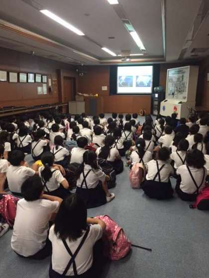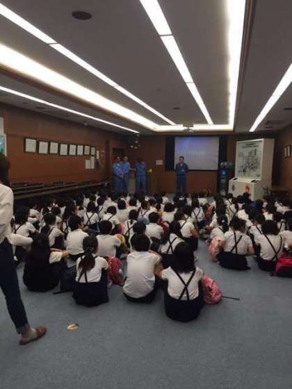 鶴見工場の方から説明を受け、ビデオで工場のことを学びます。
